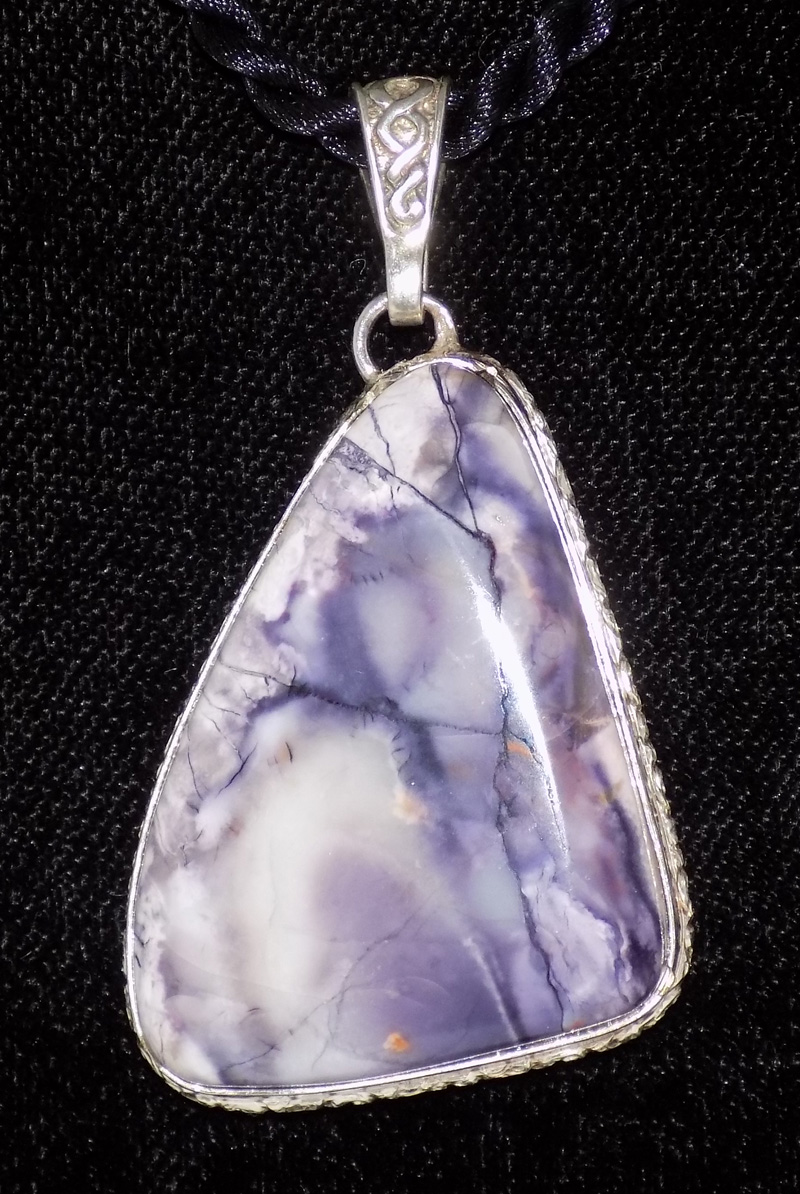 This Imperial Jasper and Sterling Silver pendant is approximately 2 1/4″ tall, including bail, and 1 1/4″ wide. It is accompanied with a braided black rayon cord.