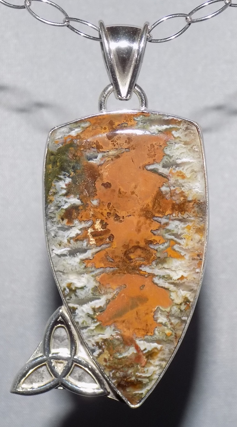 Linda Marie Plume Agate is so named because this is the name of claim on which the stone is found. The combination of colors in the stone are incredibly striking. The left and right sides of this stone seems to mirror each other. The pendant is embellished with a Trinity knot in the lower left.