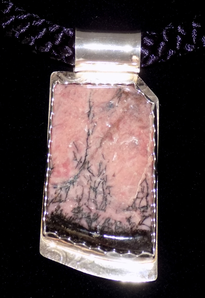 This unique Rhodonite stone is embraced by a Sterling Silver bezel, and topped with a thick Sterling Silver bail. The pinks in the stone are contrasted by the greys and blacks.