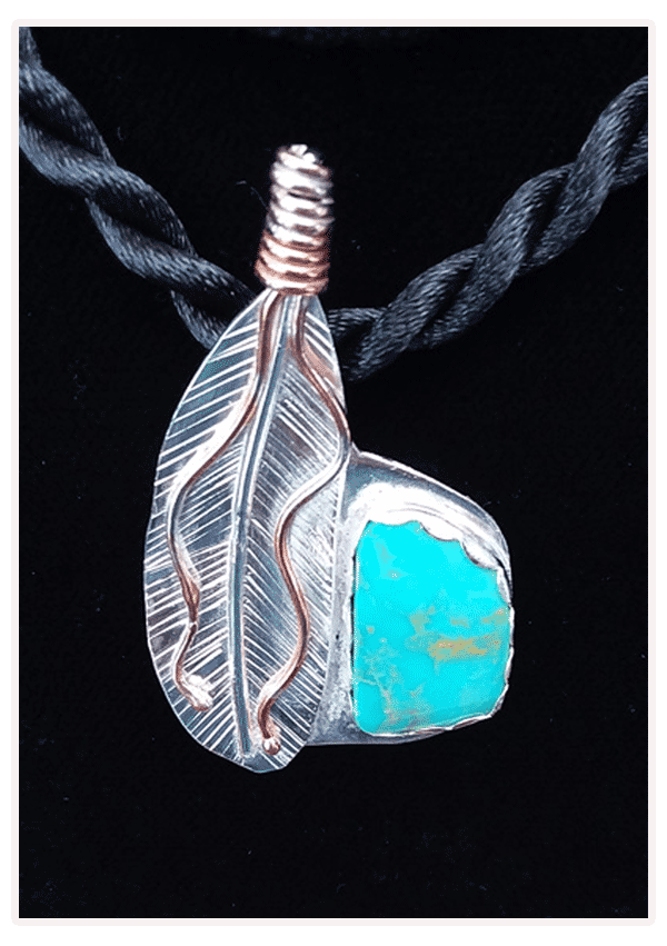 This Kingman Turquoise and Sterling Silver Feather pendant is approximately 2 1/8″ tall, and 1 1/4″ wide.