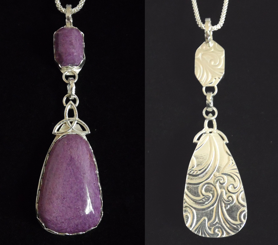 Stitchtite is known for its lovely colors. Those colors can range between pink to lilac to deep purple. Stitchtite was first discovered in Tasmania, Australia. This pendant is unique in that it is a double drop — two Stitchtite stones. Note the unique pattern that I have embossed into the rear of the Sterling Silver setting. The lower lower stone is topped with a Sterling Silver Celtic knot. This necklace is accompanied by an 18 inch Sterling Silver Chain.
