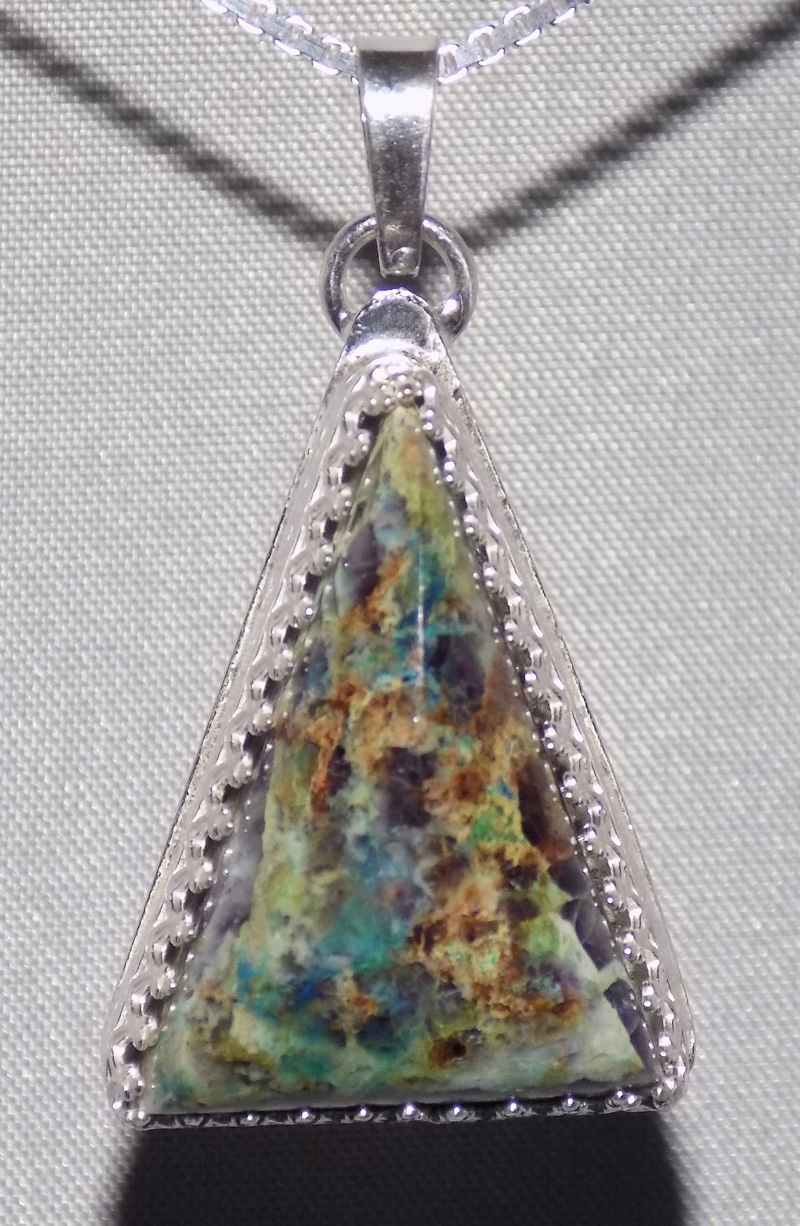 I have decided on a new name for Kaleidascope Agate. As mentioned on my other designs for this stone, this stone is technically not an agate, but a conglomerate. It is a collection of Malachite, Chrysocolla, and Fluorite. I have decided to name it Technicolor Dream. I think the name fits! This pendant is set in a Sterling Silver bezel.