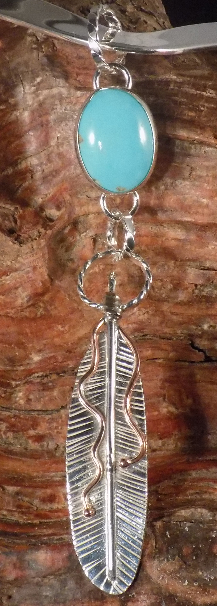 Castle Dome Turquoise Pendant with Sterling Sterling Feather with copper accents Drop Necklace